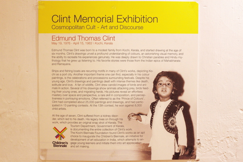 The Kochi-Muziris Biennale 2014 showcased an exhibition of select works of Clint during the inauguration of Children’s Biennale segment on December 16. The exhibition was held at the Cosmopolitan Cult - Art and Discourse Art Gallery. The gallery is situated inside Heritage Arts, an antique store in Jew Town, Mattancherry, that has attracted antique lovers and tourists from across the world.